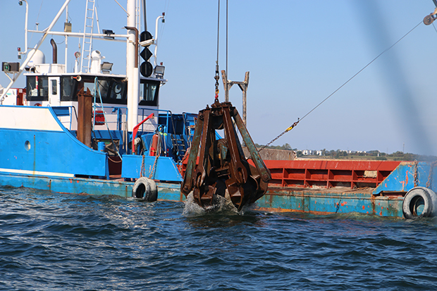 De tunge sten, der bruges til etablering af stenrev i Køge Bugt fragtes på det gode skib M/S Vilma Høj. Foto: Allan Scheller.